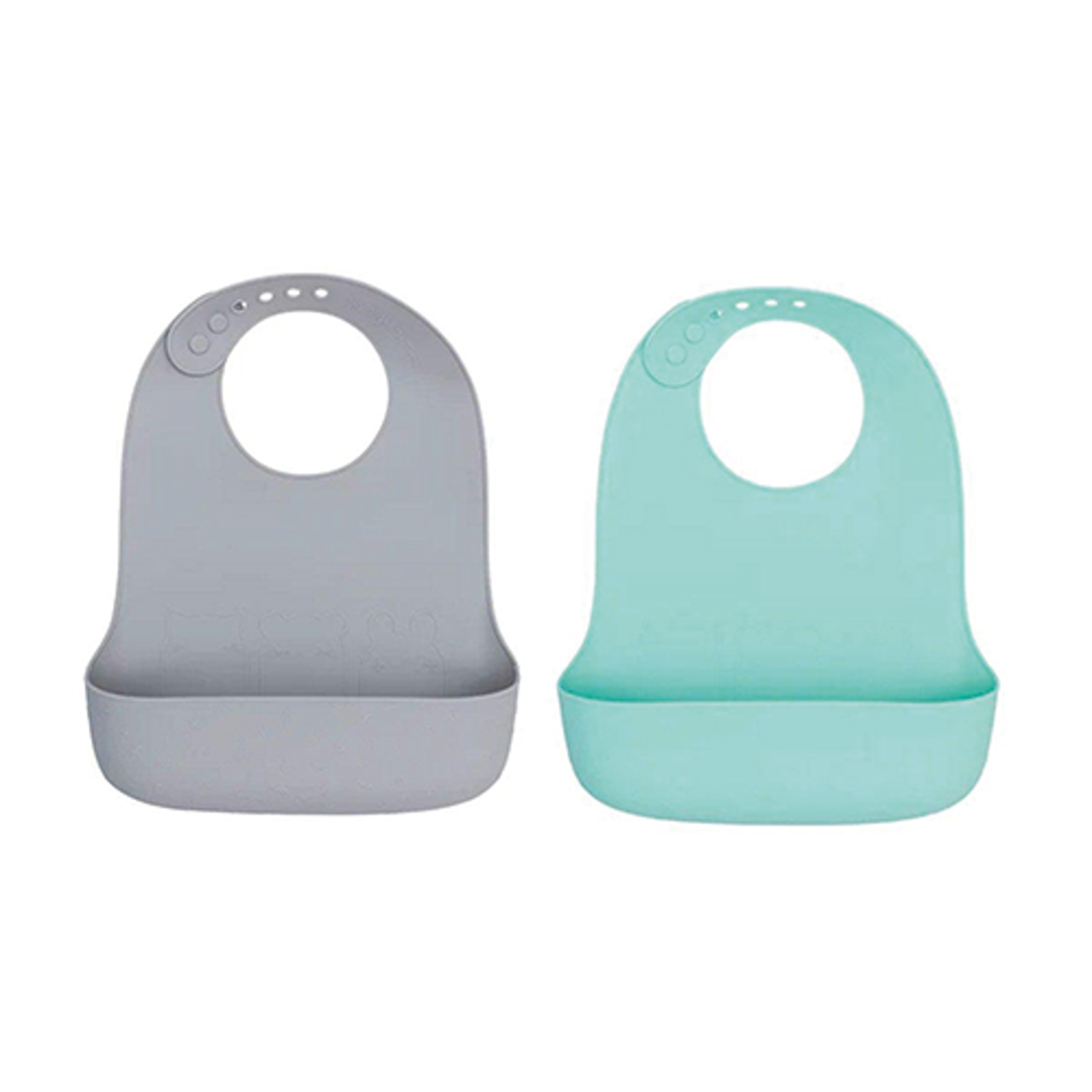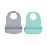 Pratico set di 2 bavagli in morbido silicone con la tasca raccogli briciole più grande e più capiente rispetto a quella del modello precedente.