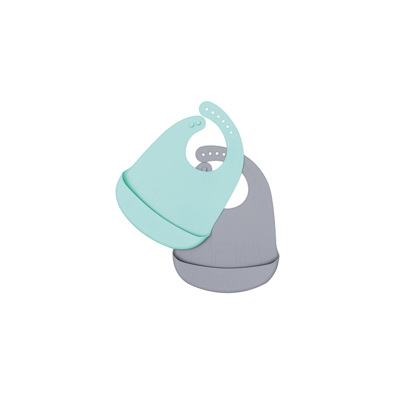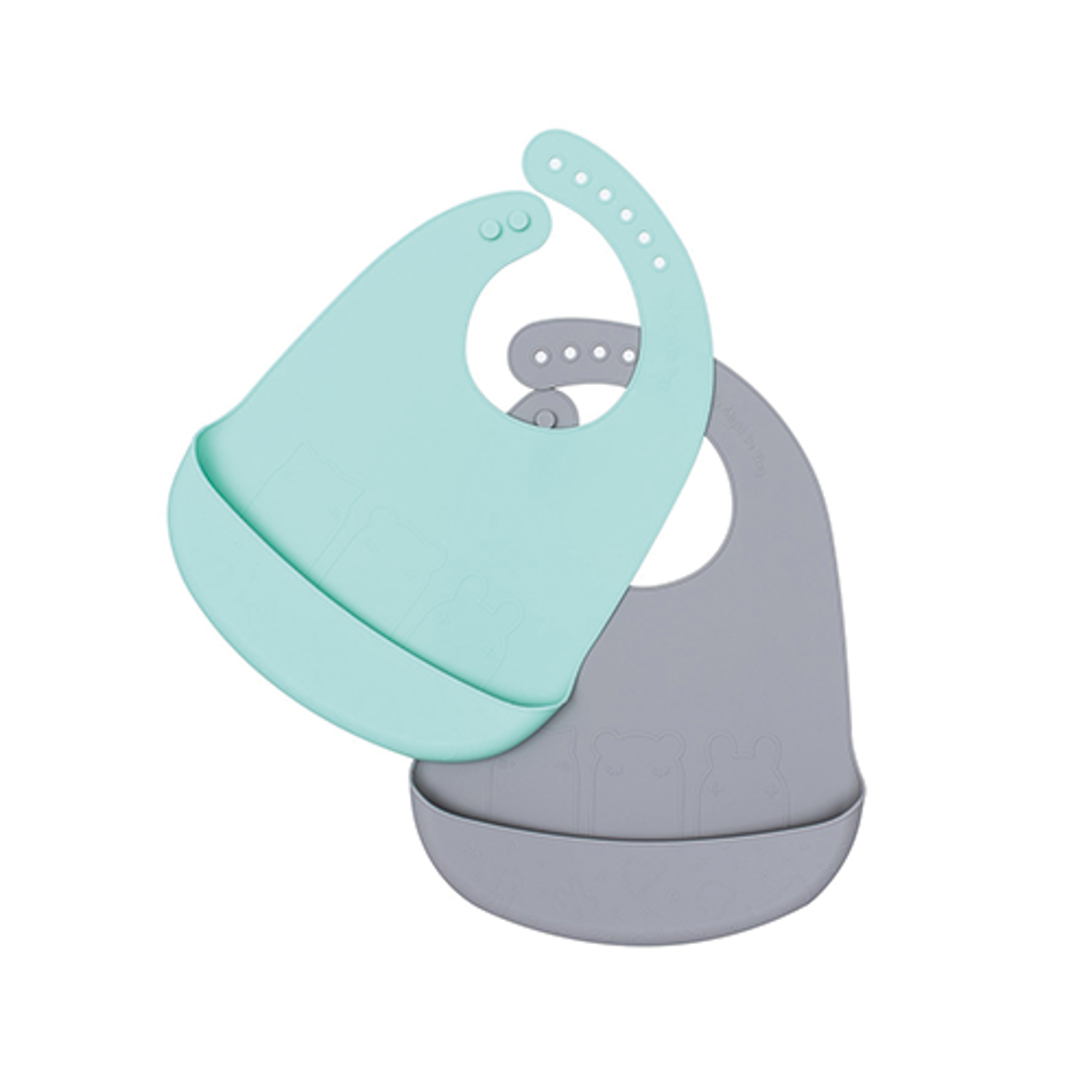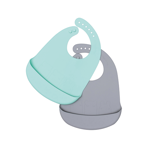 Pratico set di 2 bavagli in morbido silicone con la tasca raccogli briciole.