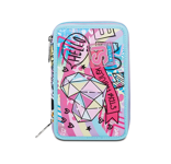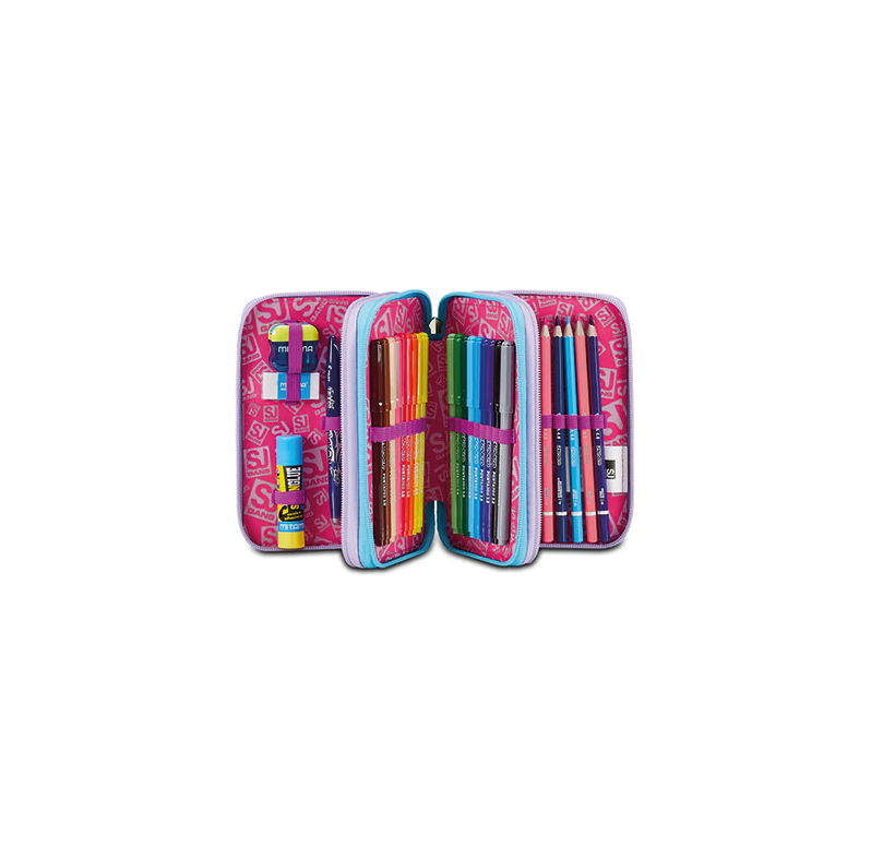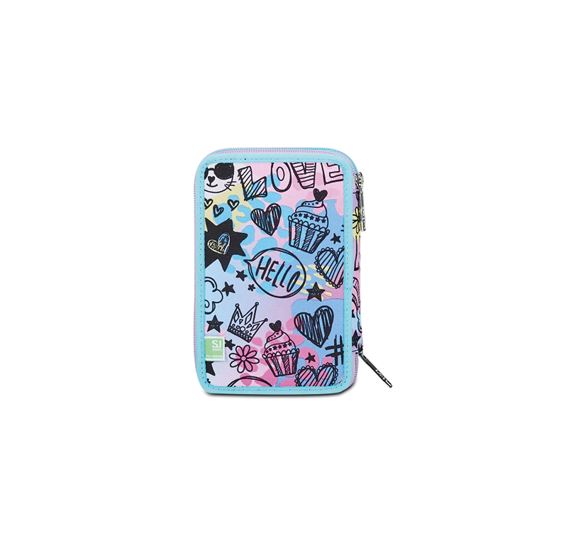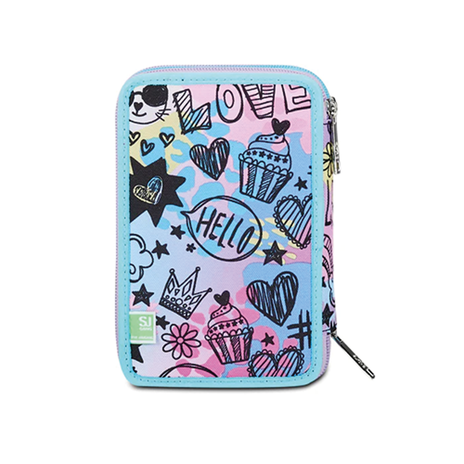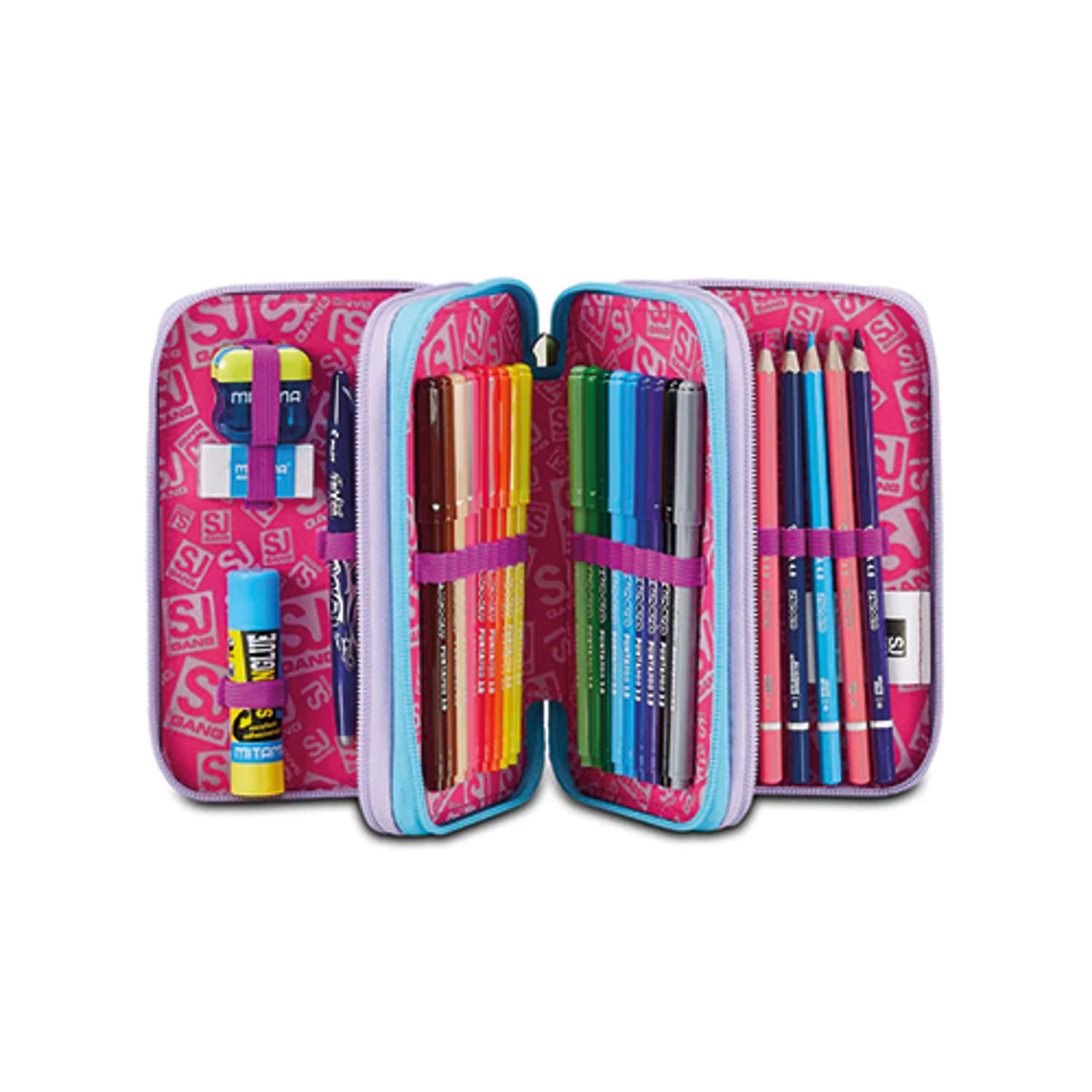 Ciao! Sono il coloratissimo Astuccio 3 zip SJ Gang. Dotato di 3 scomparti completi di tutto il materiale necessario per fare al meglio i tuoi lavori di scuola, puoi abbinarmi a uno zaino o a un trolley SJ Gang.