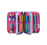 DIMENSIONI: 20 x 12,5 x 7 cm TASCHE: Triplo scomparto ALTRE CARATTERISTICHE: Contenuto 45 pezzi: 1 Penna cancellabile blu, 1 Penna a sfera rossa, 18 Pastelli, 18 Pennarelli, 1 Matita HB, 1 Colla, 1 Gomma, 1 Temperino barilotto 2 fori, 1 Righello, 1 Pastello tondo 4.0 bicolor, 1 Forbice in metallo TESSUTO: Poliestere