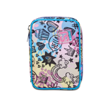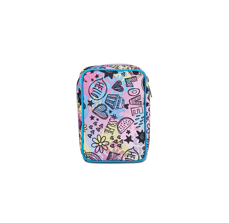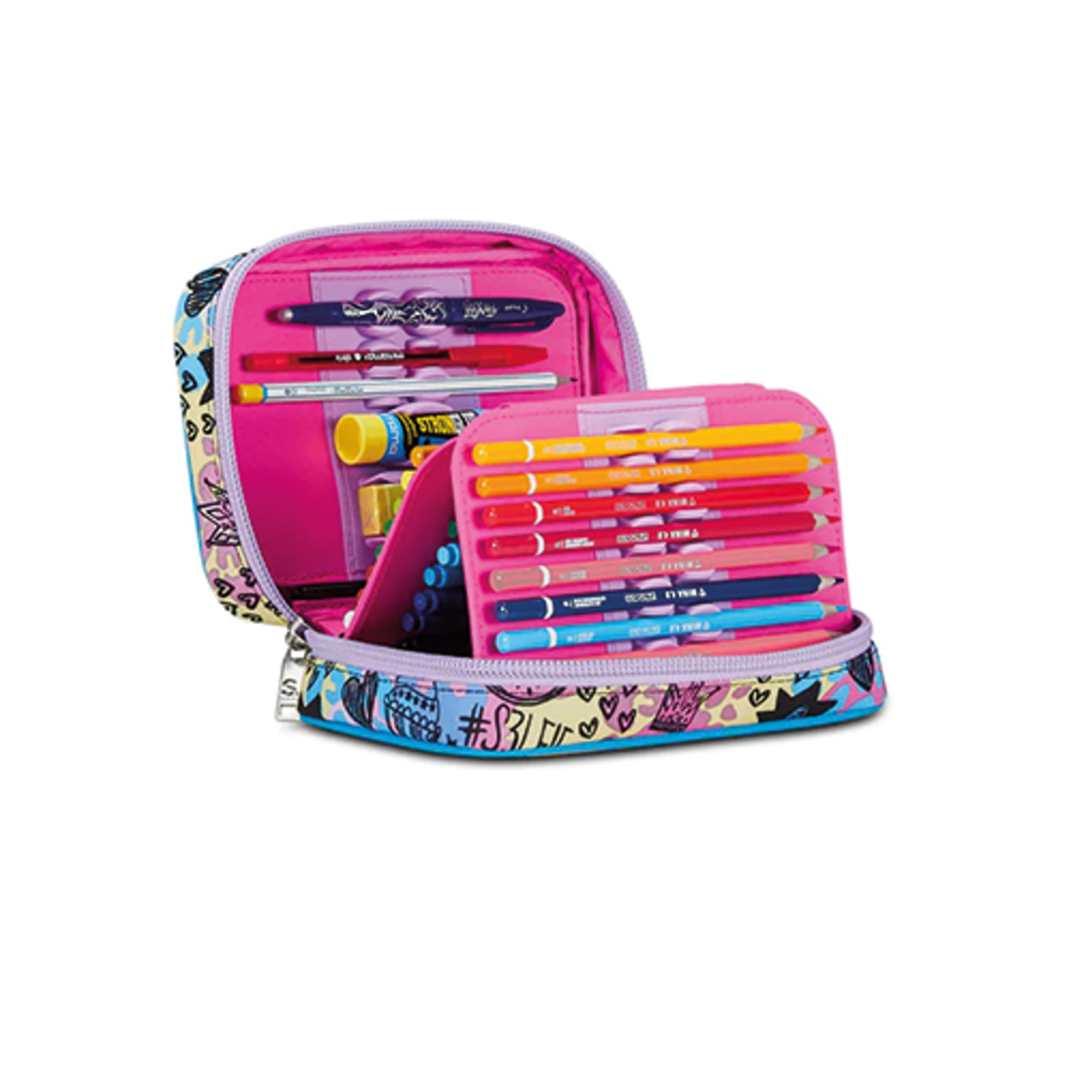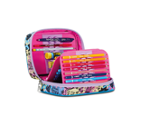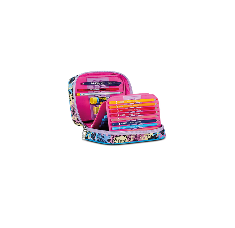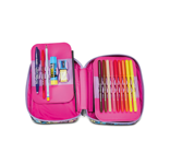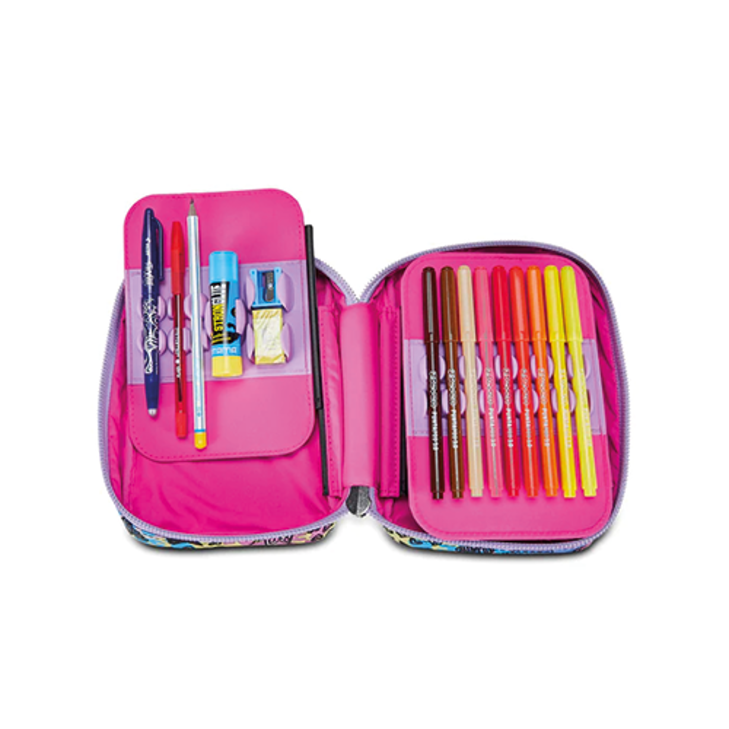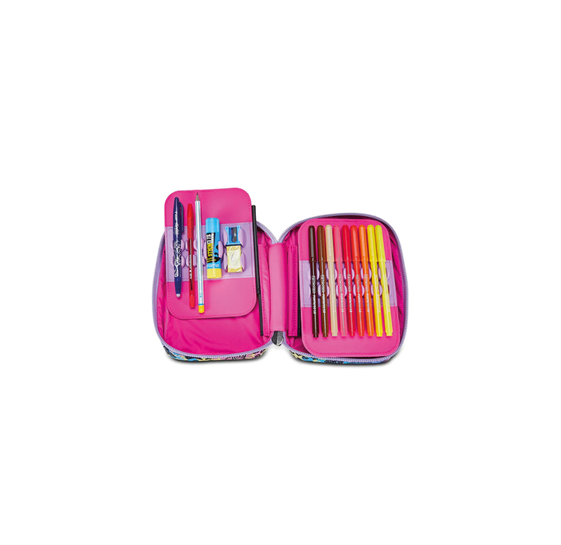 DIMENSIONI: 15 x 21 x 7 cm ALTRE CARATTERISTICHE: Apertura singola tramite maxi zip, plance amovibili, agganci flessibili in gomma per cancelleria. Astuccio lavabile. Contenuto 44 pezzi: 1 Penna cancellabile blu, 1 Penna a sfera rossa, 18 Pastelli, 18 Pennarelli, 1 Matita HB, 1 Colla, 1 Gomma, 1 Temperino, 1 Righello, 1 Forbice in metallo TESSUTO: Poliestere