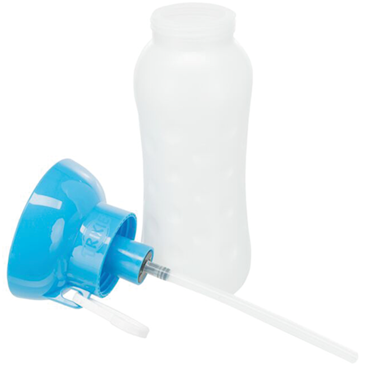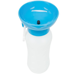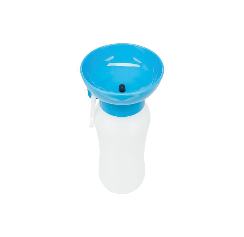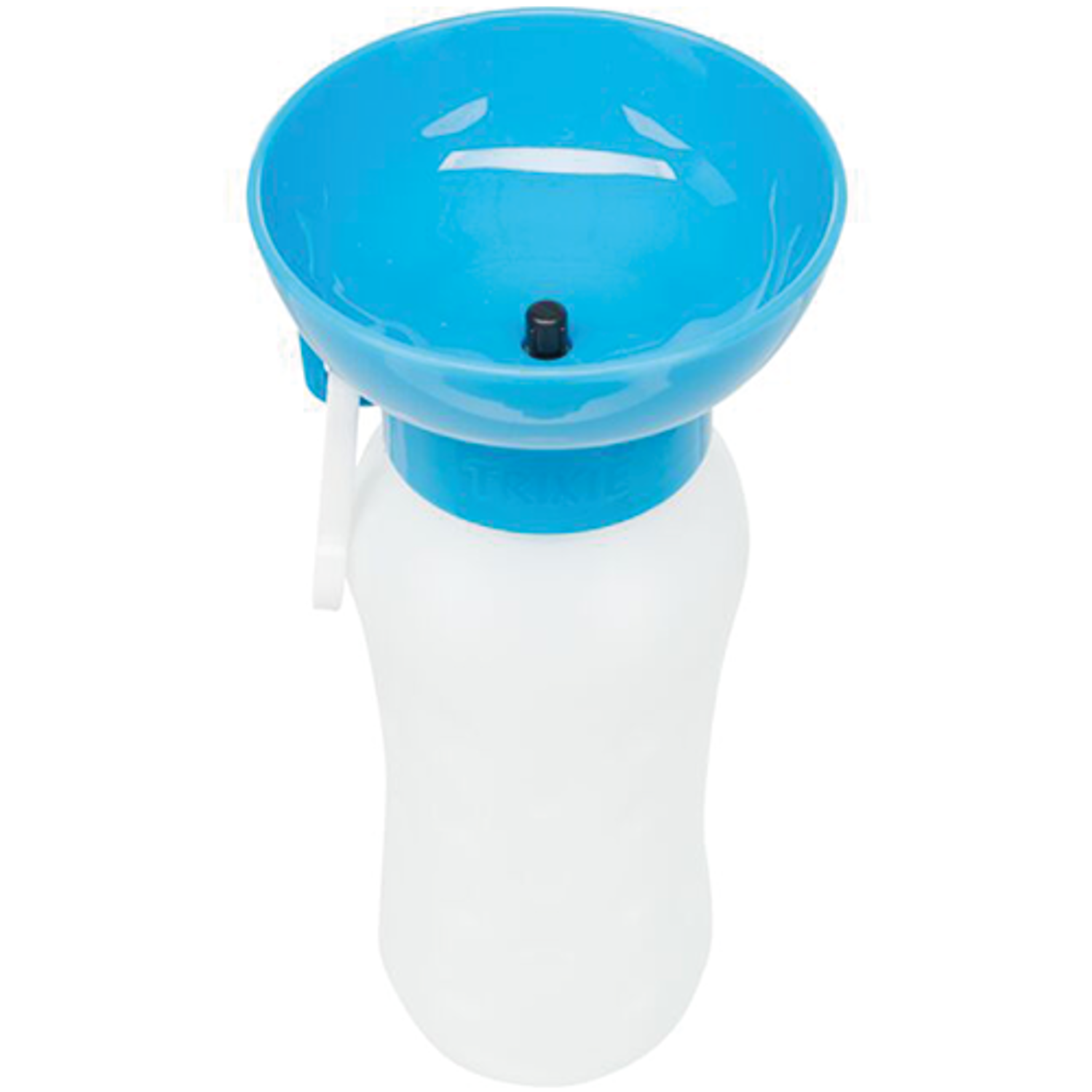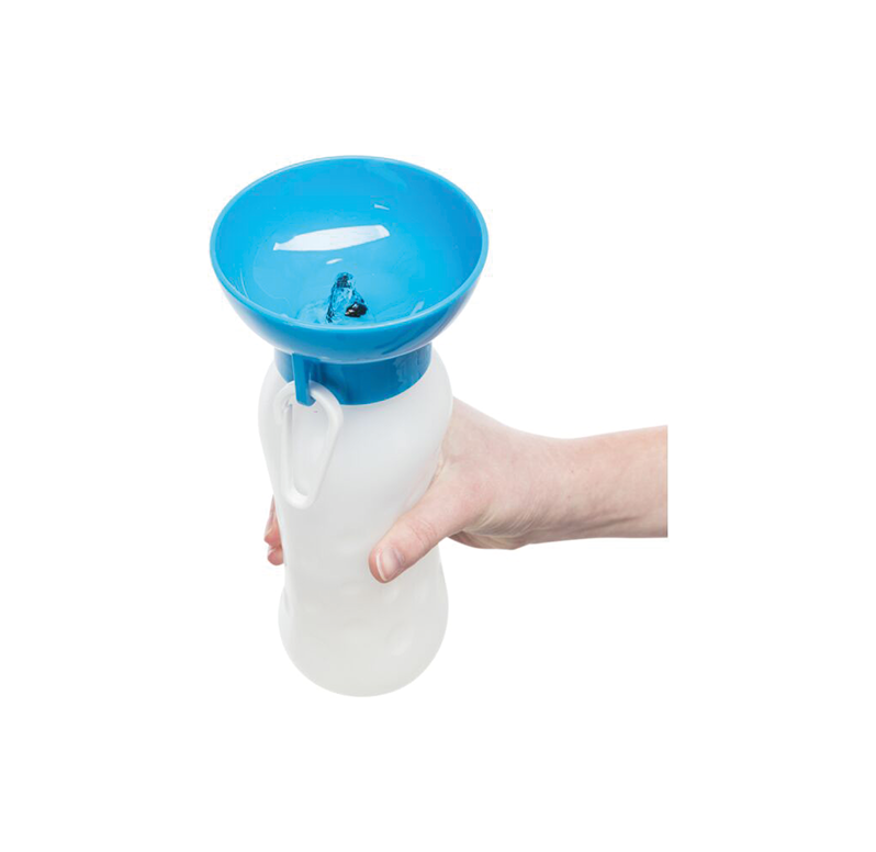 Bottiglia in plastica con ciotola nella parte superiore. Premendo la bottiglia, l'acqua fluisce nella ciotola e permette al cane di bere.