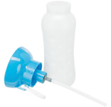 Bottiglia in plastica con ciotola nella parte superiore. Premendo la bottiglia, l'acqua fluisce nella ciotola e permette al cane di bere.