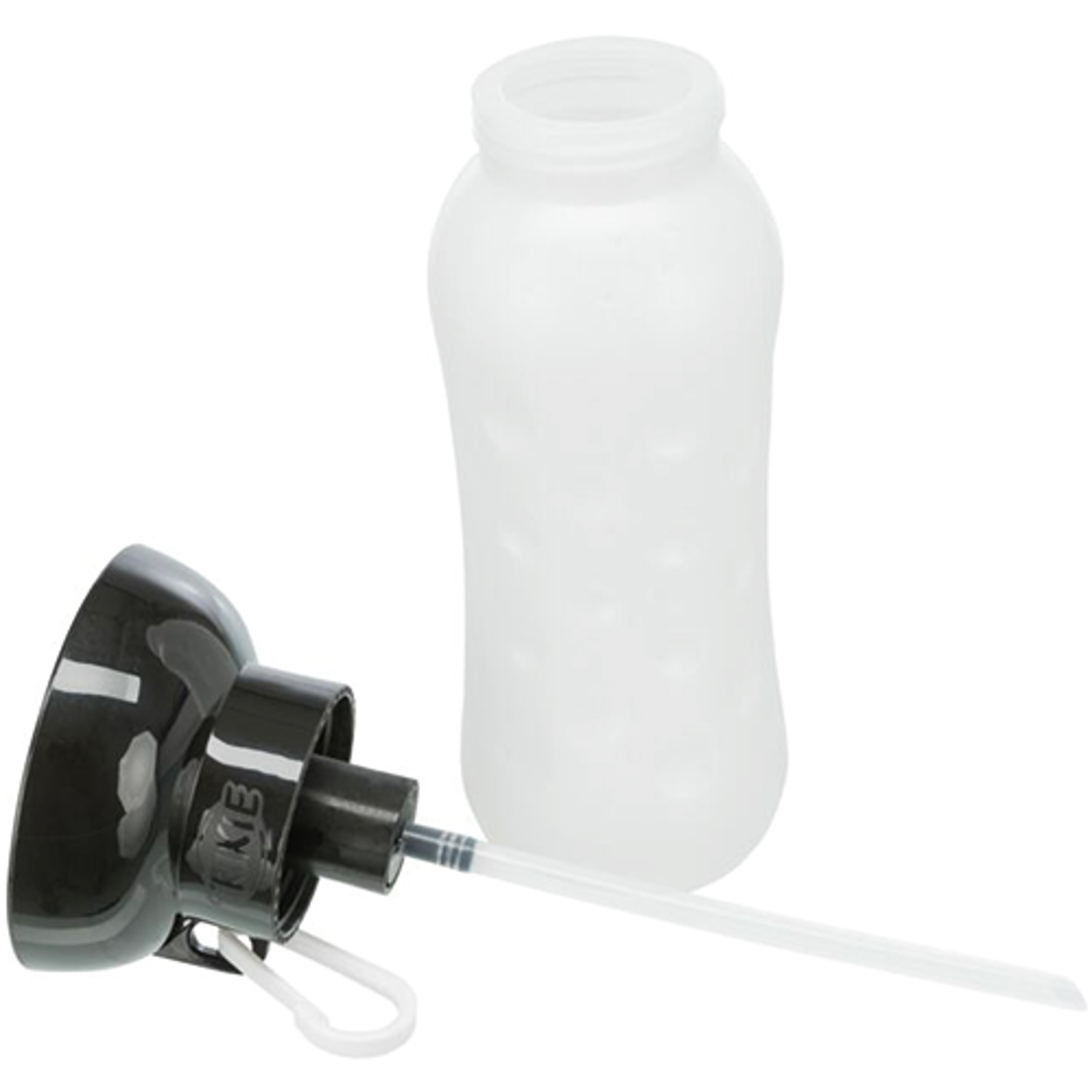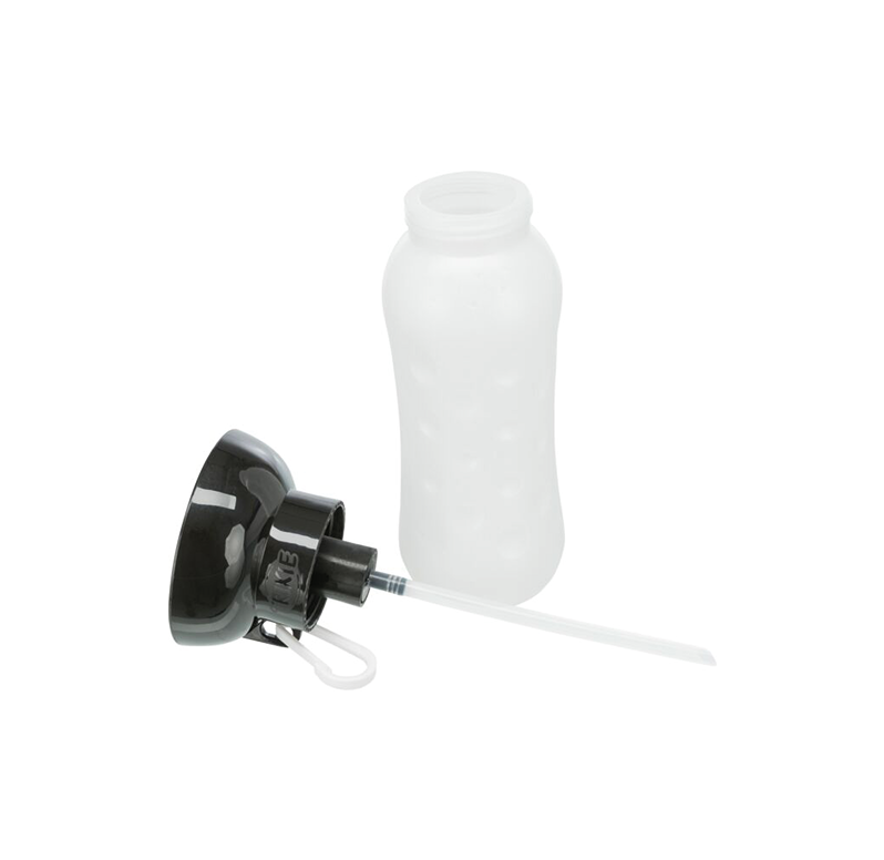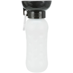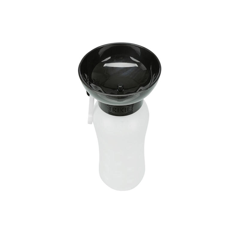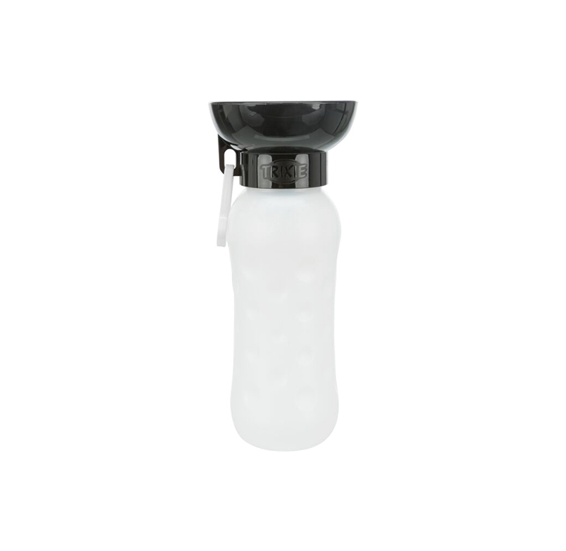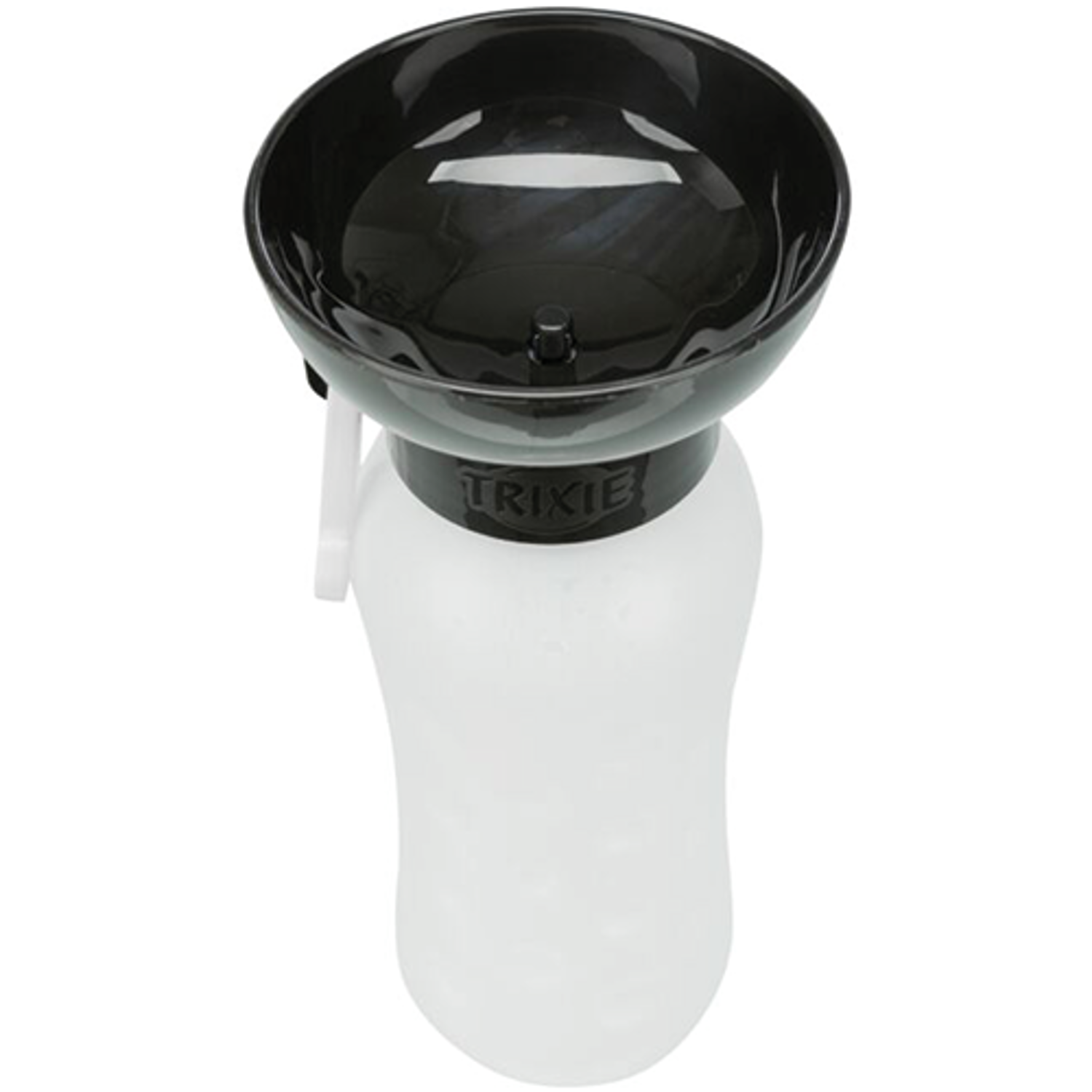 Bottiglia in plastica con ciotola nella parte superiore. Premendo la bottiglia, l'acqua fluisce nella ciotola e permette al cane di bere.