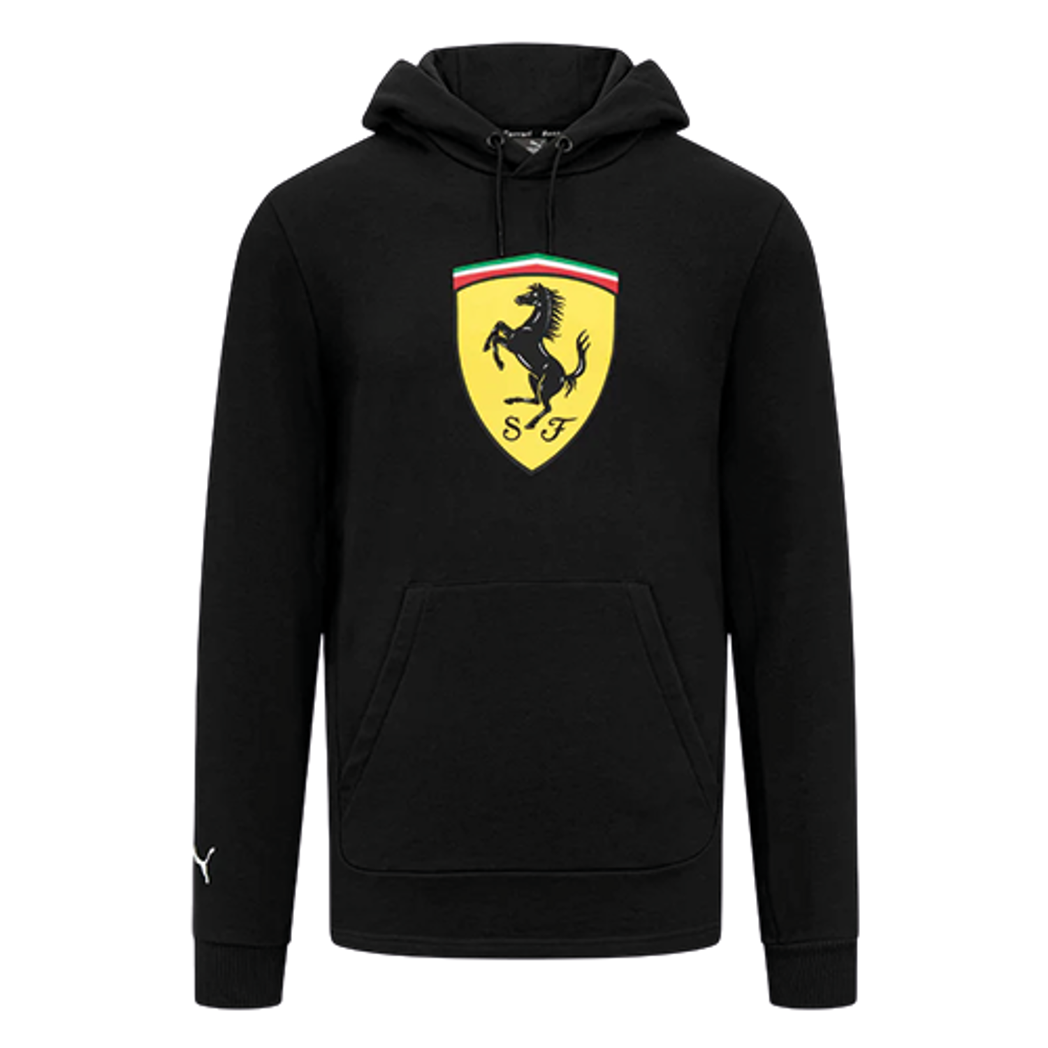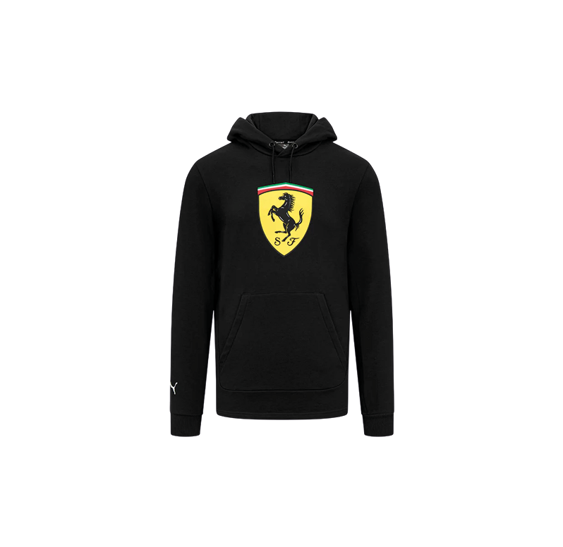 Official PUMA Scuderia Ferrari Shield Hoodie, con una vivace stampa dello Scudetto Ferrari sul petto. Il colore nero è ispirato alla livrea delle vetture di Formula 1 del team.