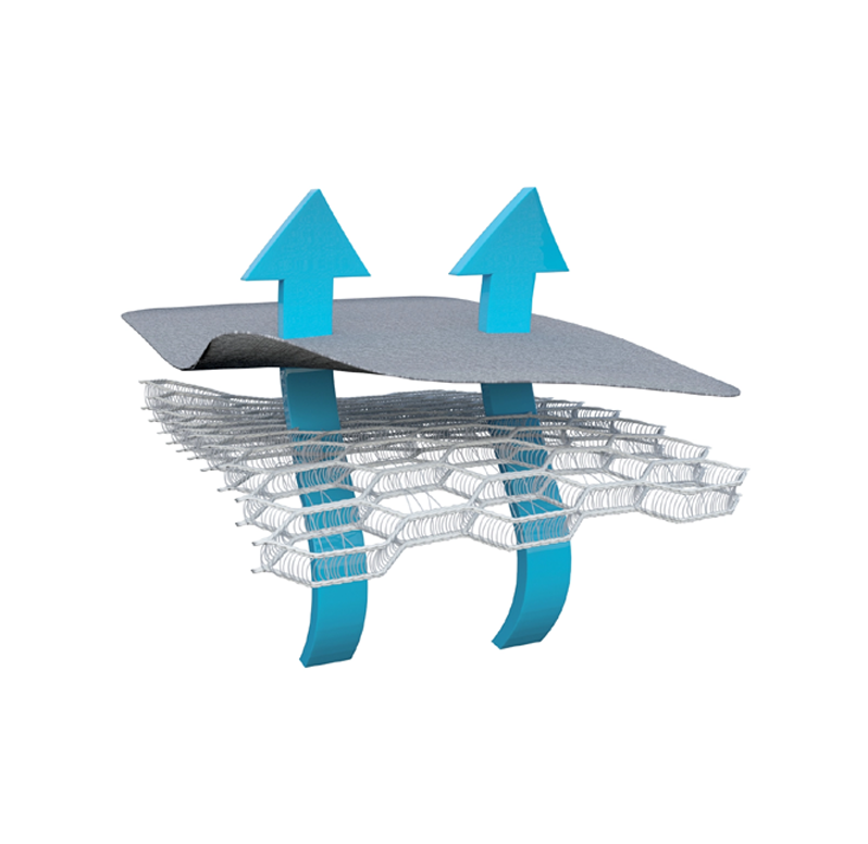La struttura 3D non si comprime sotto il peso del corpo garantendo sempre un flusso d'aria costante e impedendo il ristagno del calore in eccesso. L'aria circola liberamente attraverso la struttura a maglie aperte e allontana calore e umidità garantendo una seduta sempre fresca e asciutta.