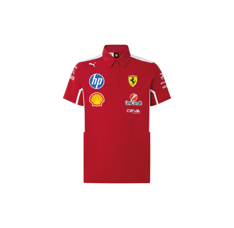 La polo della collezione Ferrari 2025, ispirata al capo ufficiale indossato dal team Scuderia Ferrari, celebra l'estetica del Campionato Ferrari di Formula 1.