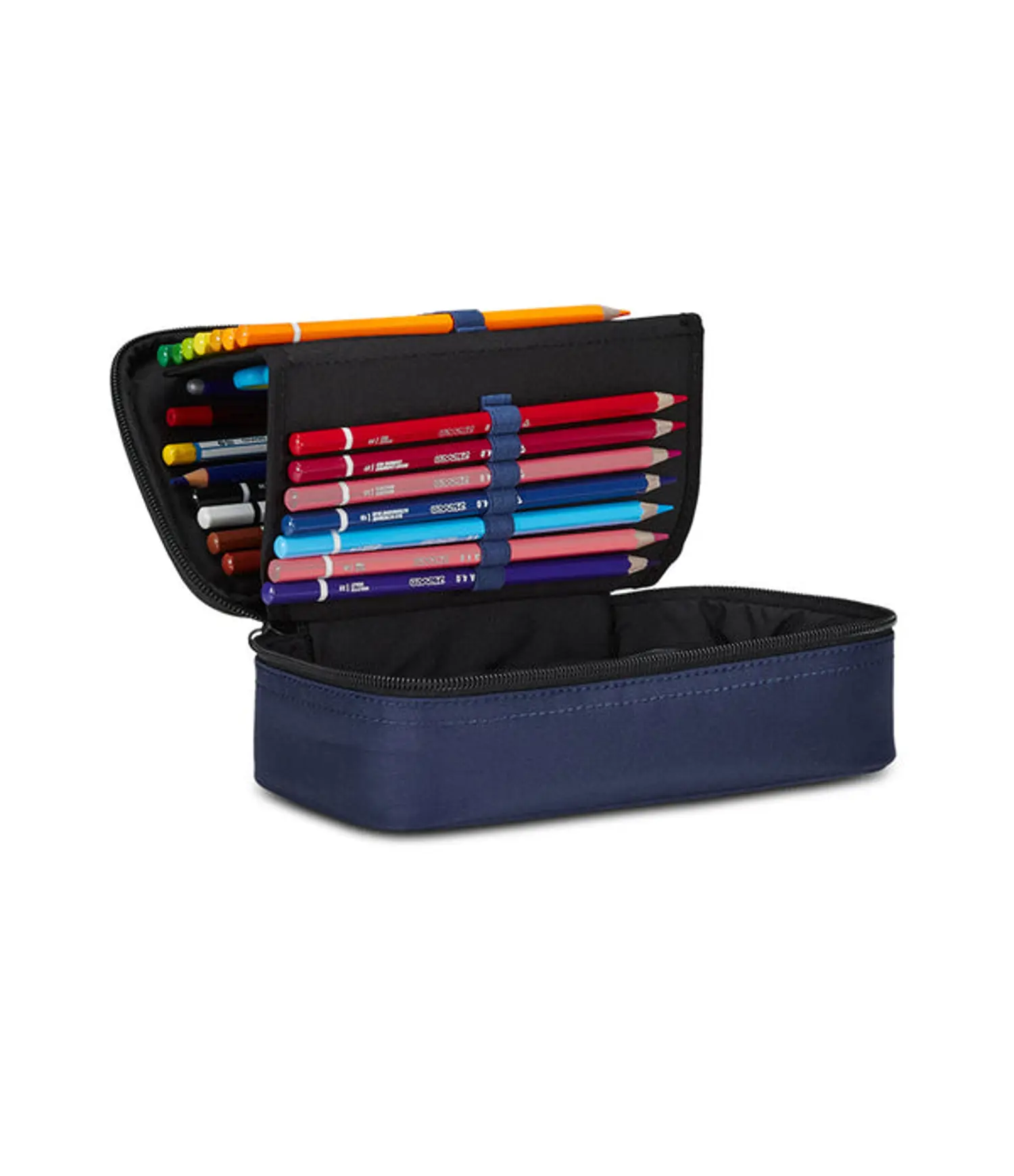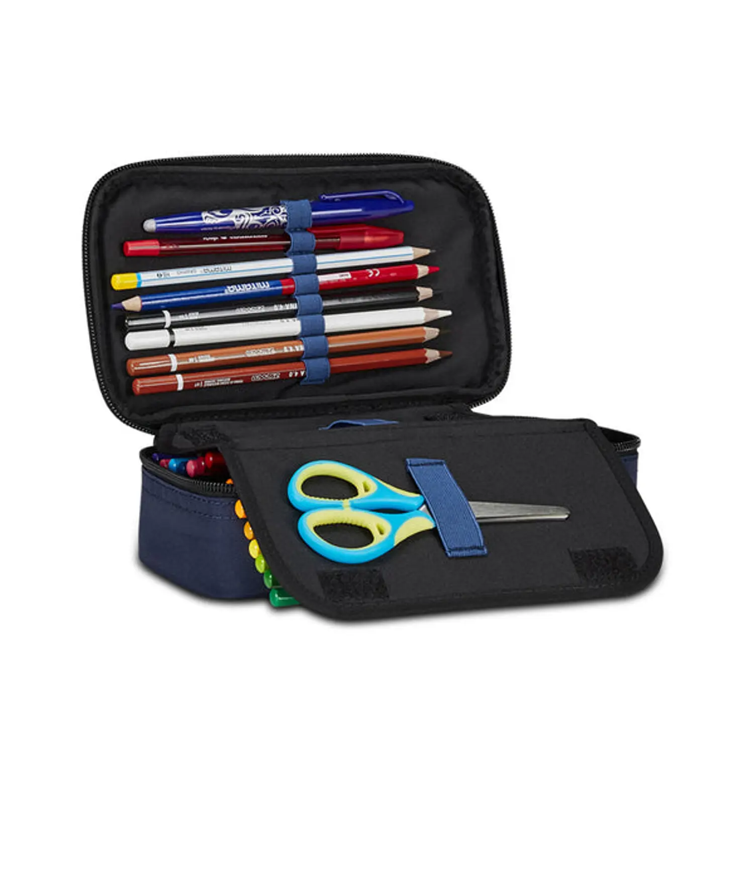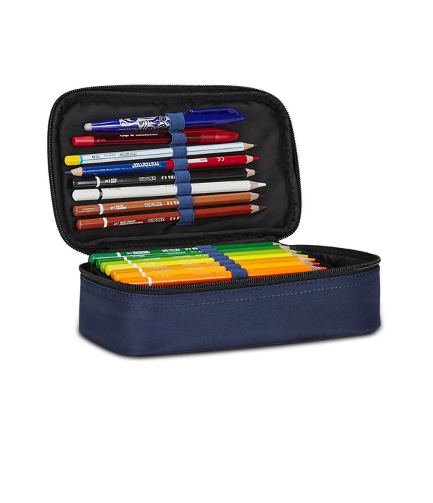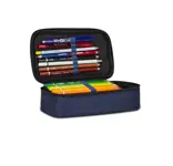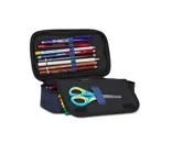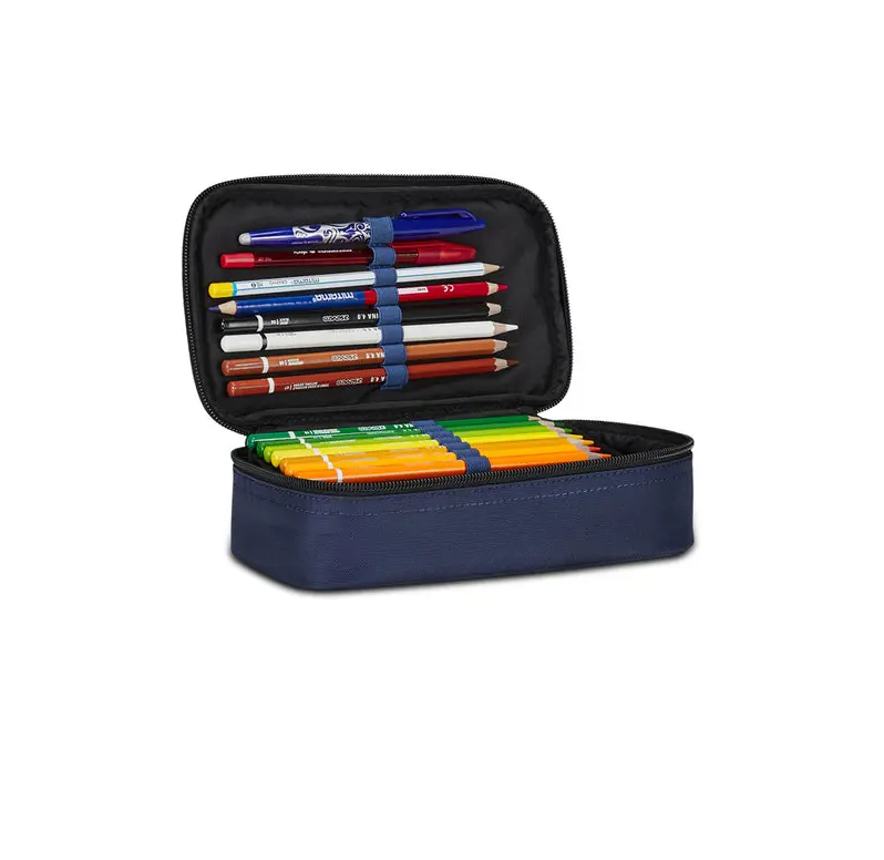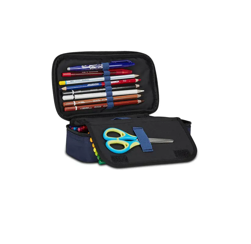 DIMENSIONI: 23,5 x 11 x 6 cm CONTENUTO: 45 pezzi: 1 Penna cancellabile blu, 1 Penna a sfera rossa, 18 Pastelli a colori, 18 Pennarelli, 1 Matita HB, 1 Colla stick, 1 Gomma, 1 Temperino barilotto due fori, 1 Righello, 1 Pastello tondo 4.0 bicolor, 1 Paio di Forbici in metallo TESSUTO: Poliestere