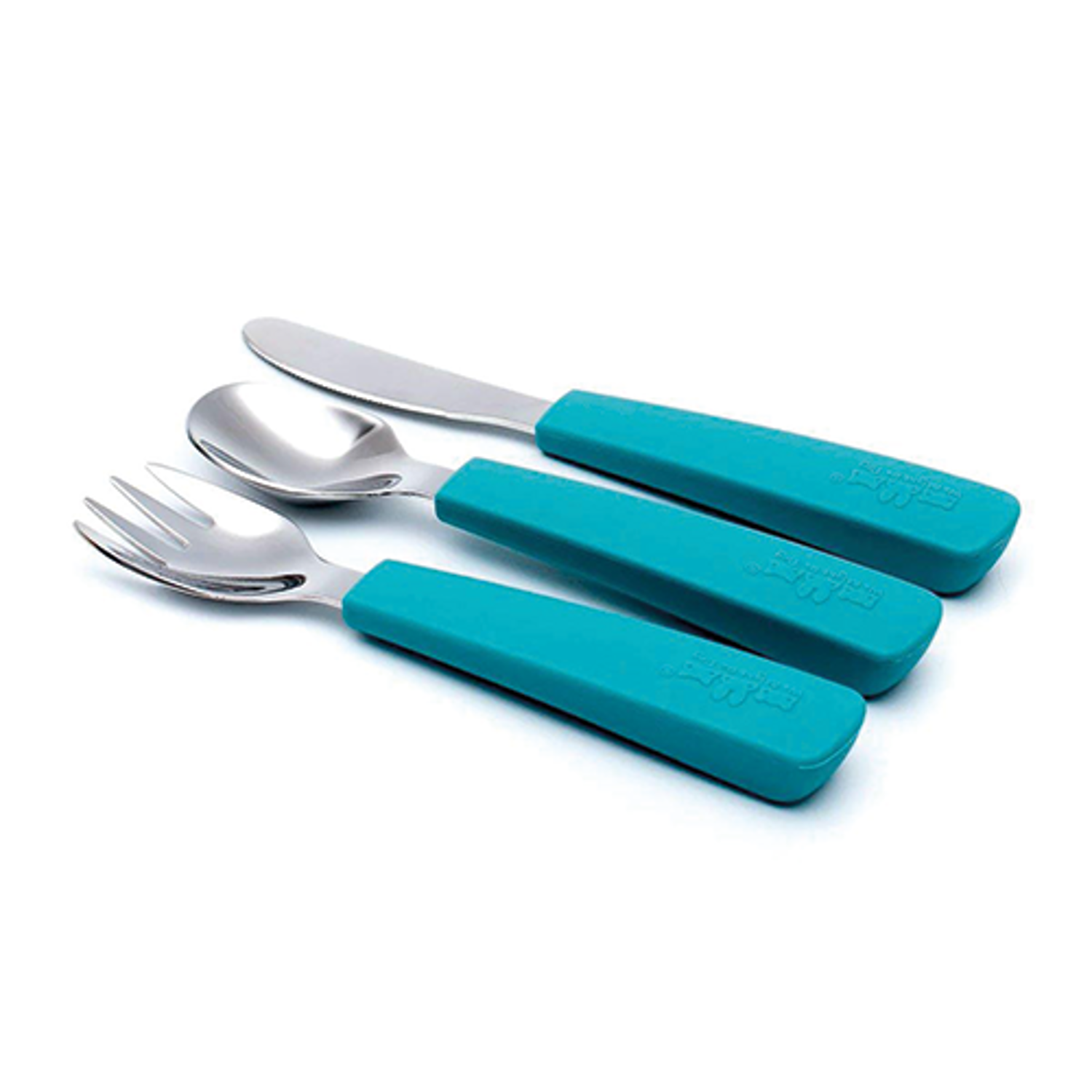 Set di 3 posate Feedie in silicone con le punte in acciaio inox, pratiche, con impugnatura ergonomica, perfette per le piccole mani.