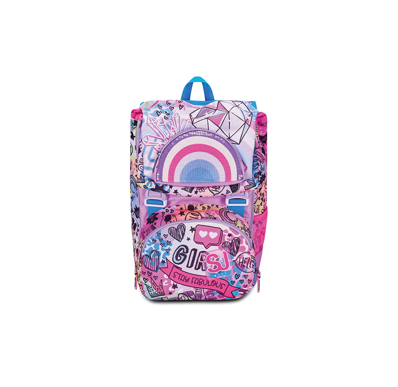 Ciao! Sono COLORJAM, lo zaino SJ GANG dal design ergonomico certificato IGR e dotato di LOAD CONTROL SYSTEM: un sistema di regolazione integrato per bilanciare il peso all’interno dello zaino, facendolo aderire meglio alla schiena. In questo modo avrai una maggiore sensazione di comfort ed equilibrio! Sono dotato di una tasca sagomata con zip a forma di ARCOBALENO con paillettes trasparenti sulla pattina superiore e ho un ampio doppio scomparto, la cui capienza si può facilmente aumentare grazie alle zip laterali per poter accogliere e distribuire in modo ottimale libri, quaderni e tutto ciò che ti serve per la tua giornata, potendo sfruttare anche la tasca frontale e la tasca porta borraccia. Sono davvero comodo da indossare sulle spalle, grazie a schienale e spallacci confortevoli. Inoltre, attraverso la cinghia a vita amovibile e quella toracica, puoi regolare lo zaino in base alle tue esigenze. In più, il fondo integrato mantiene la mia struttura inalterata, garantendo la stabilità del contenuto anche a pieno carico.