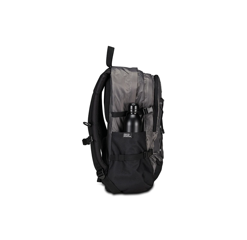 DIMENSIONI: 31 x 47 x 21 cm CAPACITÀ: 30 l SCHIENALE: Con pannello imbottito per assicurare il massimo comfort SPALLACCI: Extralarge imbottito per il massimo comfort e rivestito in tessuto. Con sotto spallaccio in rete e nastro torace regolabile TASCHE: Tasca interna con organizer, tasca porta PC, tasche laterali porta borraccia ALTRE CARATTERISTICHE: Zaino doppio scomparto con fondo rinforzato, nastri laterali per la regolazione del volume, sistema elastico anteriore con inserti riflettenti, tessuto lucido TESSUTO: 100% Poliestere riciclato, certificato "GRS"